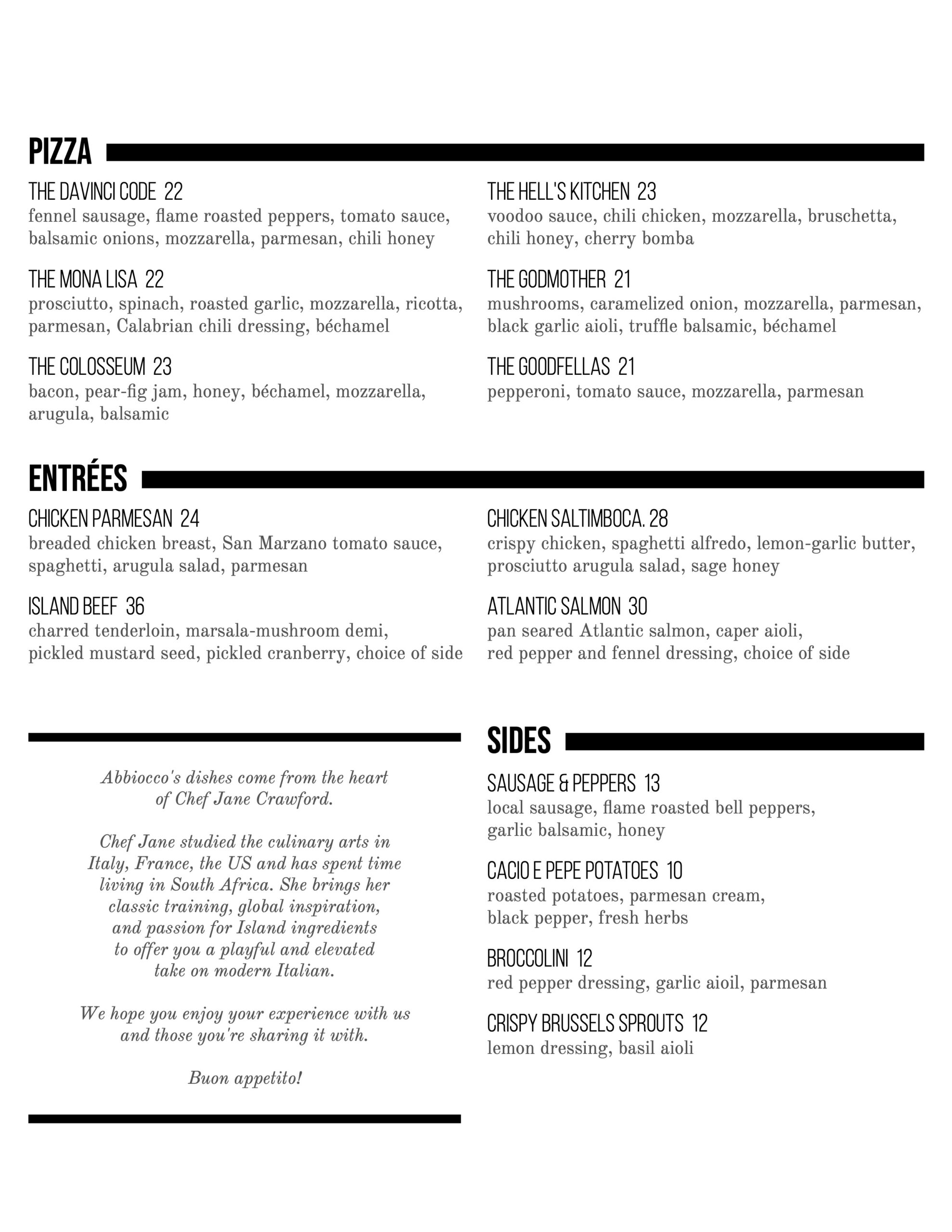 Featuring Italy-inspired meals of the highest quality from Executive Chef Jane Crawford, with a focus on simplicity and execution, both local and international quality ingredients, and a seasonally rotating menu, Abbiocco is the destination for every occasion. Leisurely lunches, afternoon cocktails, grand celebrations, intimate celebrations, business meetings, lavish private dinners, and takeout comfort. Complimenting the house-made pasta, pizza, and desserts is an innovative, exciting, and accessible wine program curated by the best in the industry. High standards of service and hospitality are prioritized in a cozy, relaxed atmosphere.